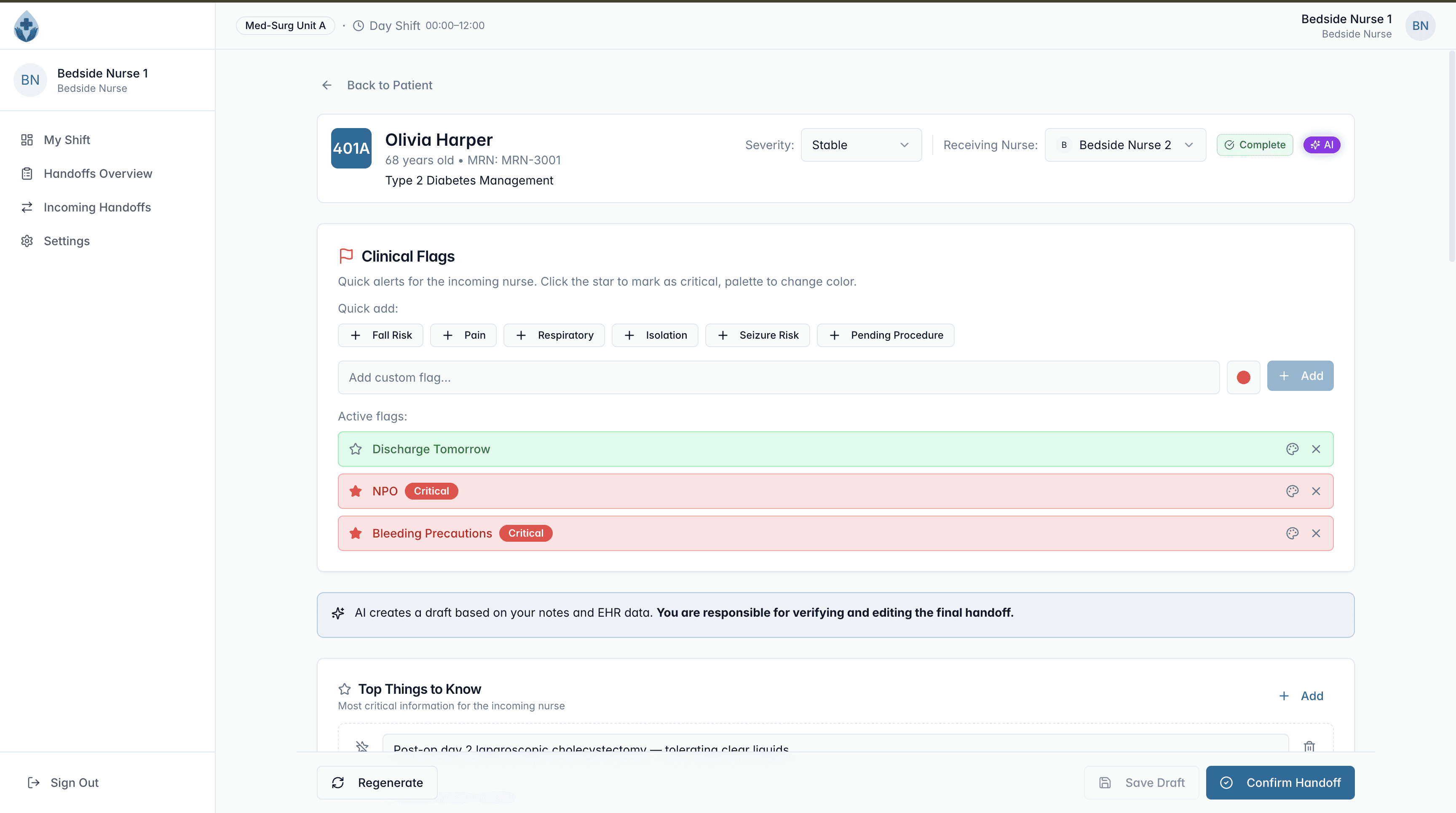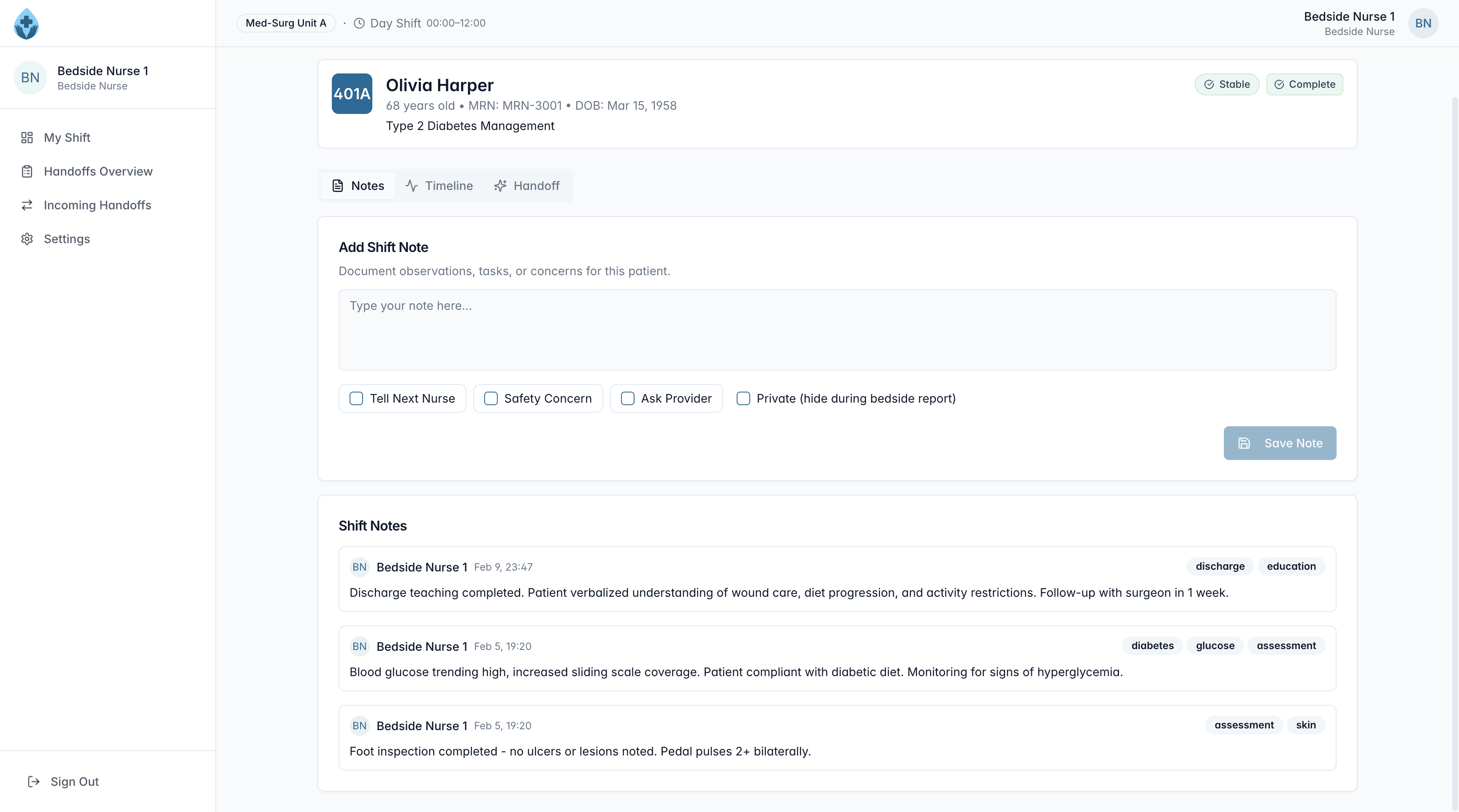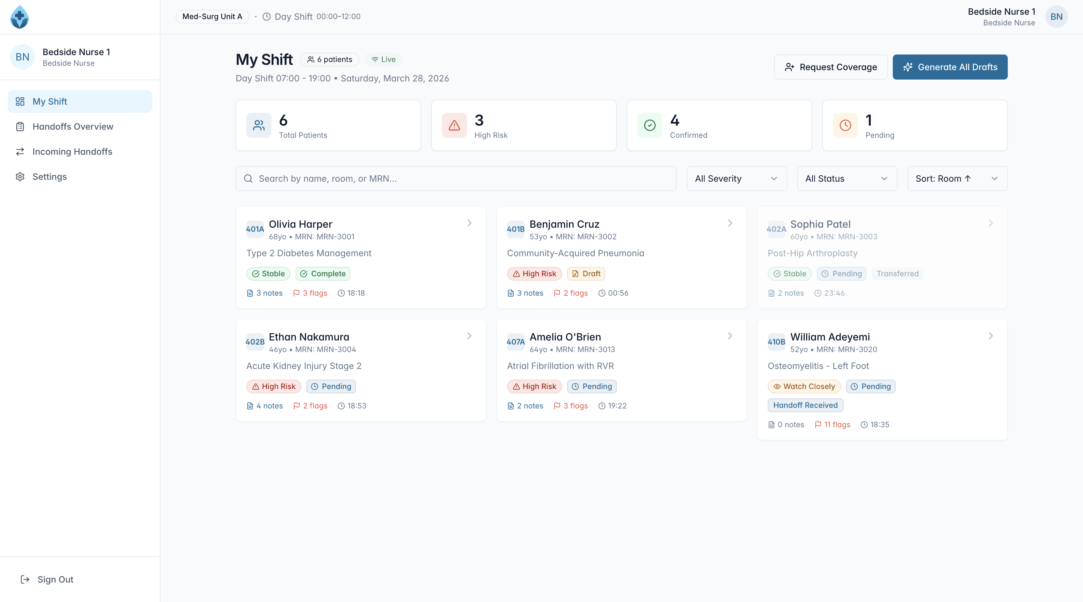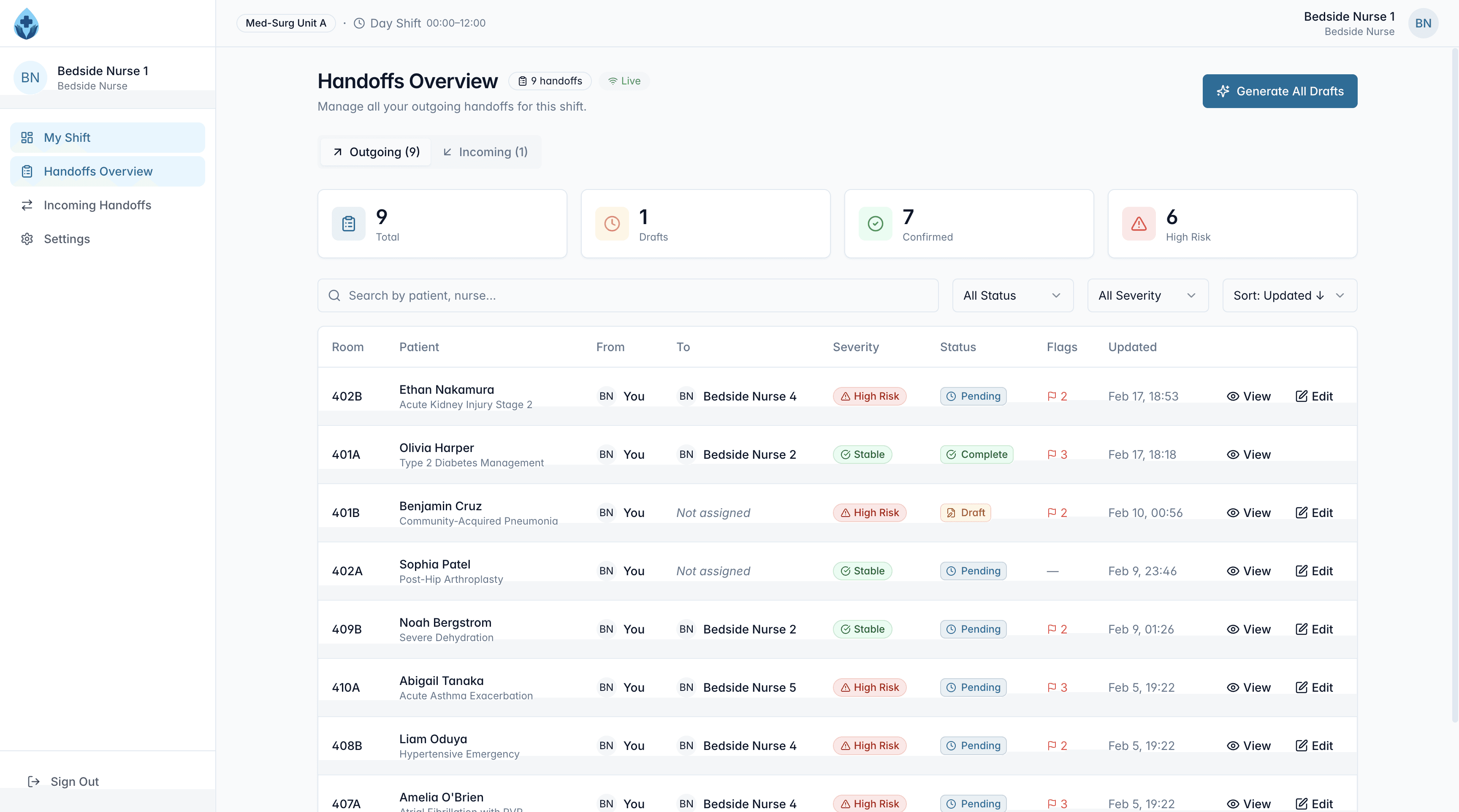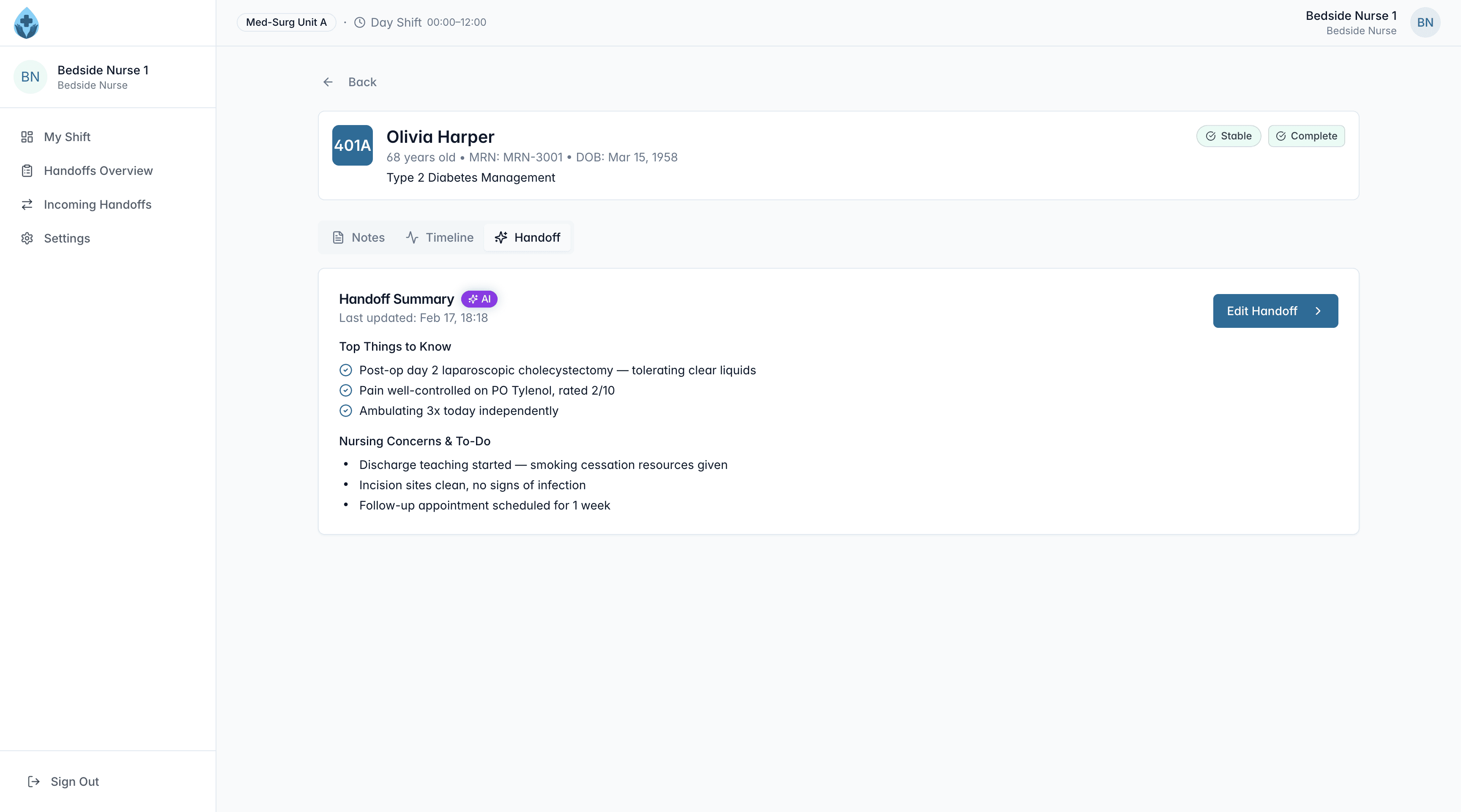 NurseShift is an AI-assisted clinical handoff platform that helps nurses transfer patient responsibility safely and efficiently across shifts.