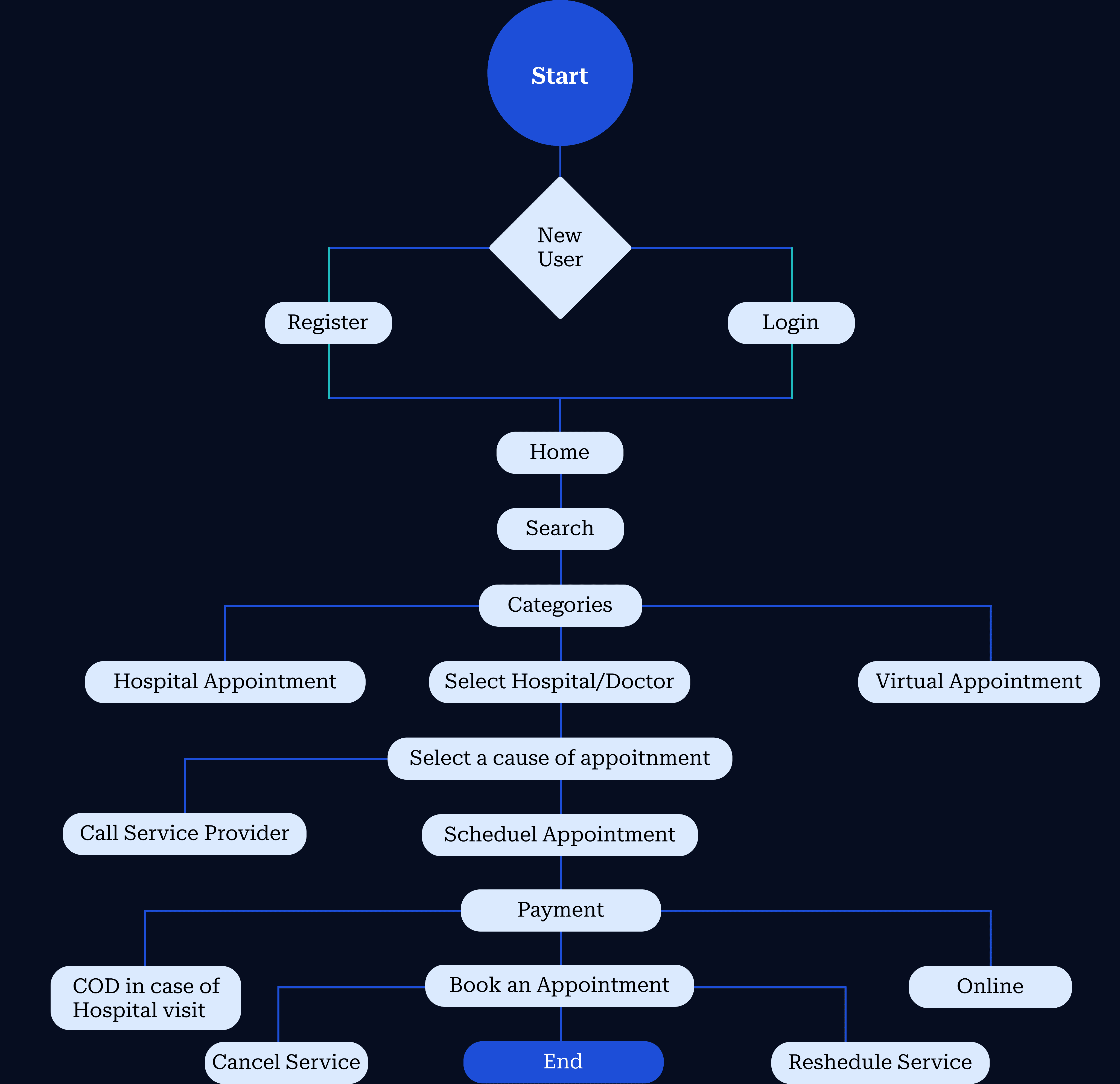 I designed a clear, healthcare-focused user flow that helps users quickly book doctors, order medicine, or request emergency services—making key actions fast, intuitive, and accessible in just a few taps.