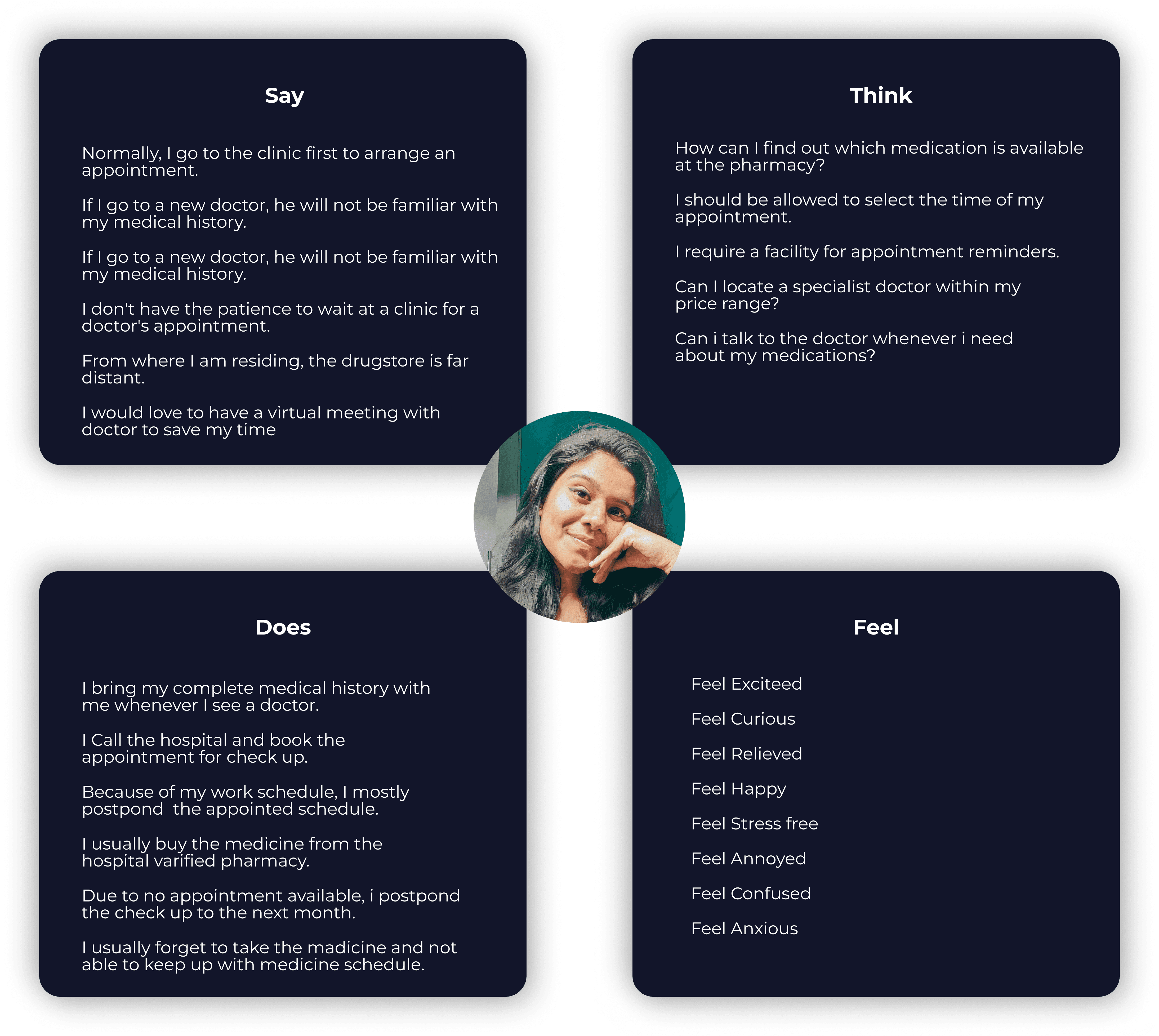 I created persona of Simran, a busy professional who frequently visits doctors, and faces common healthcare hurdles—booking appointments, missing follow-ups, and managing prescriptions. These profiles helped guide feature decisions across the platform.