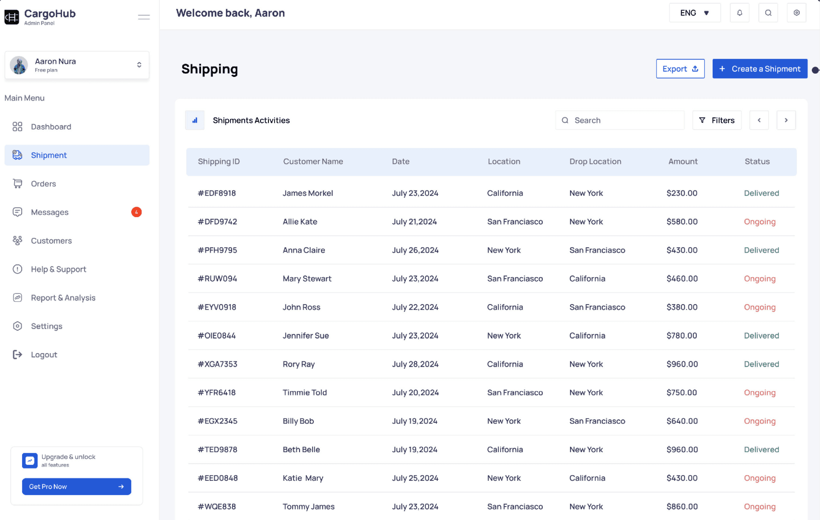 Crafted an intuitive easy-to-use dashboard page that gives users a quick view of their shipment activity at a glance.