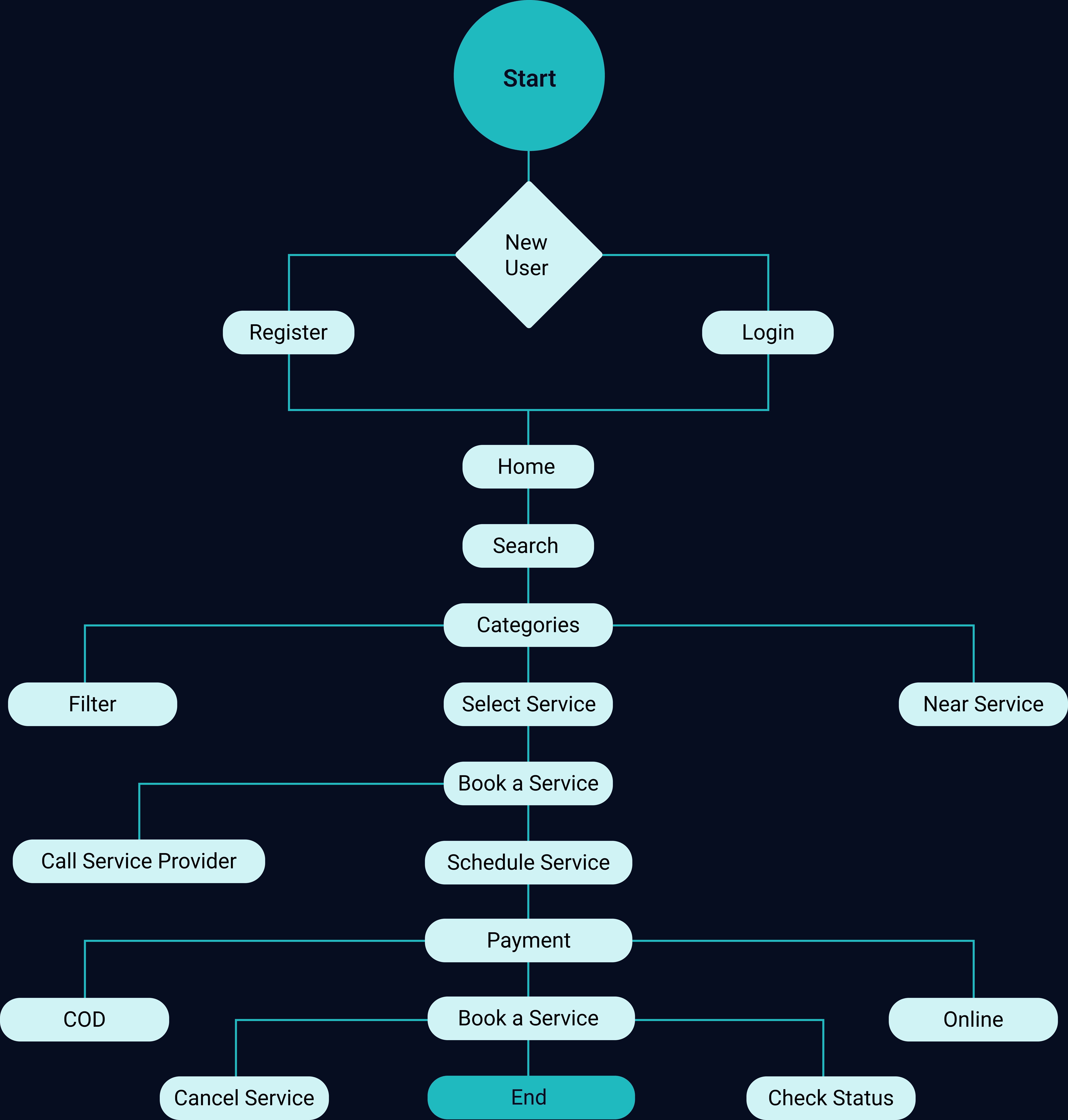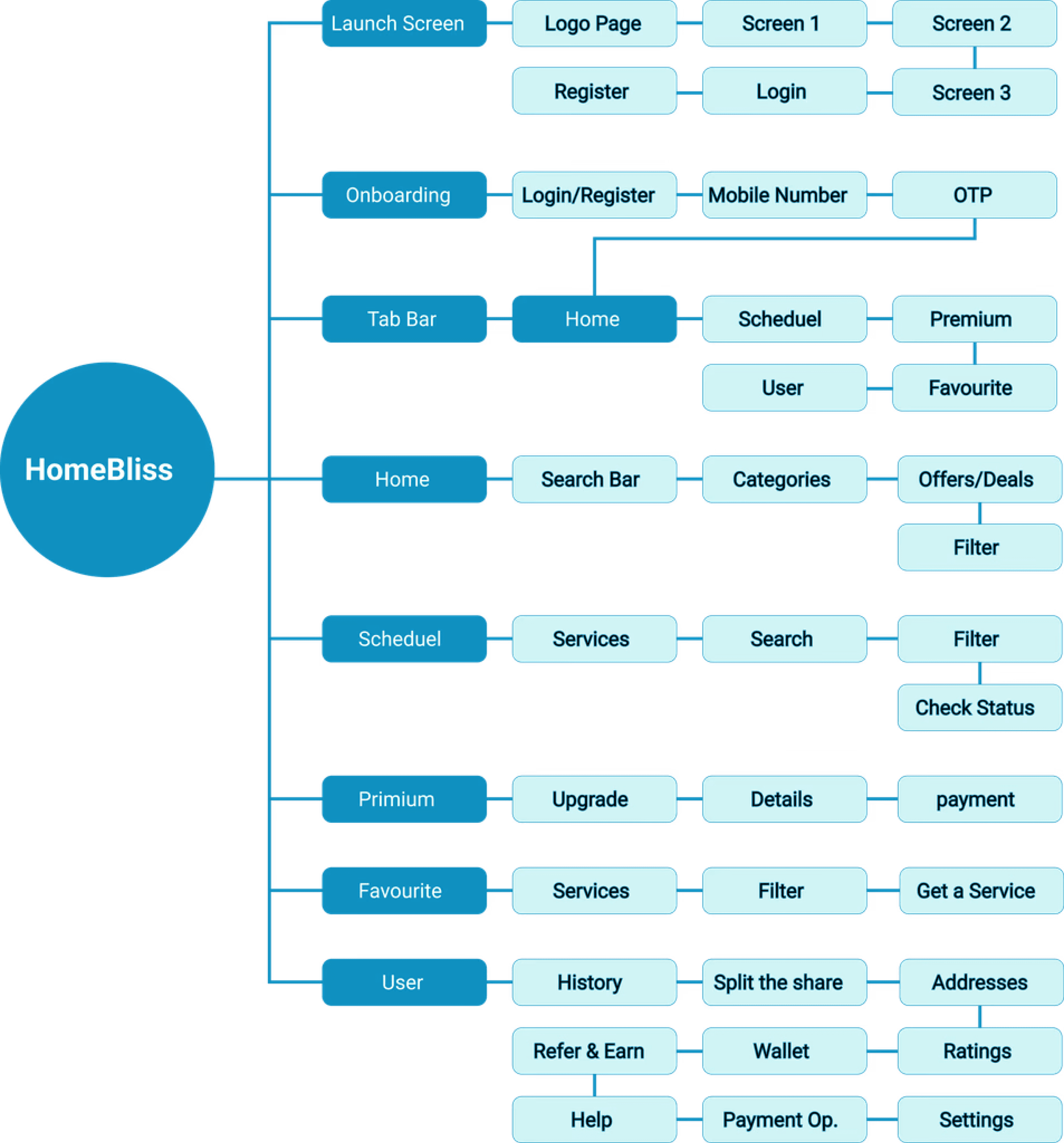 I designed a simple, task-focused user flow that guides users from onboarding to booking and managing services. It keeps key actions—like scheduling or payment—quick and accessible in just a few taps.