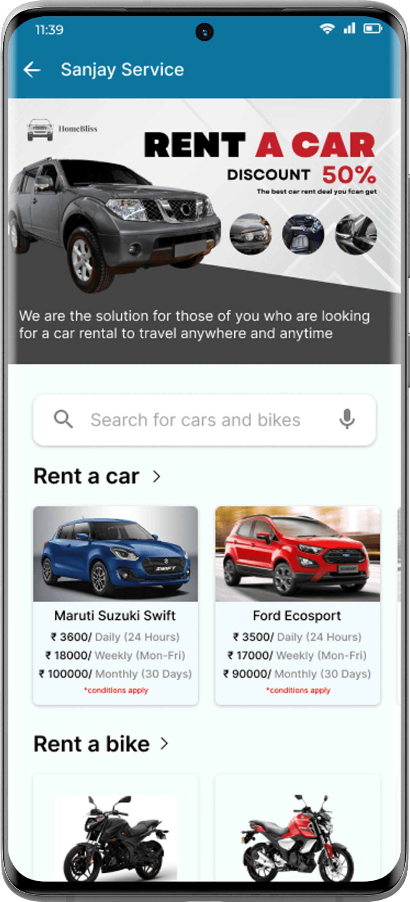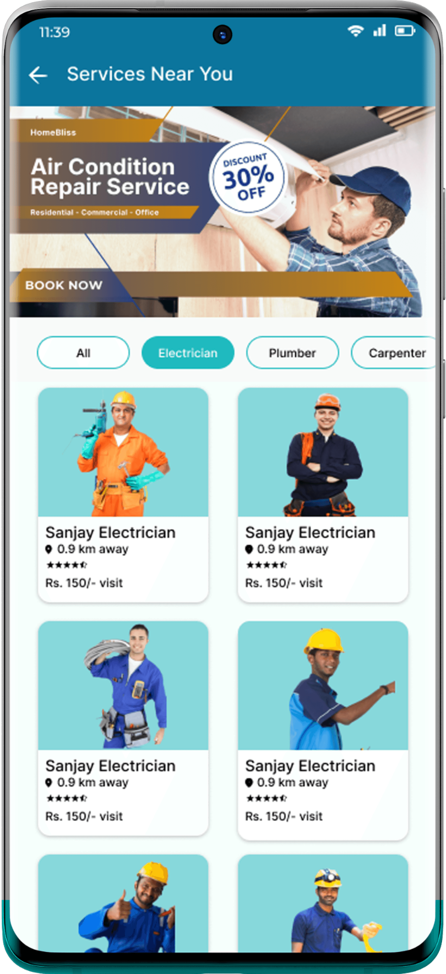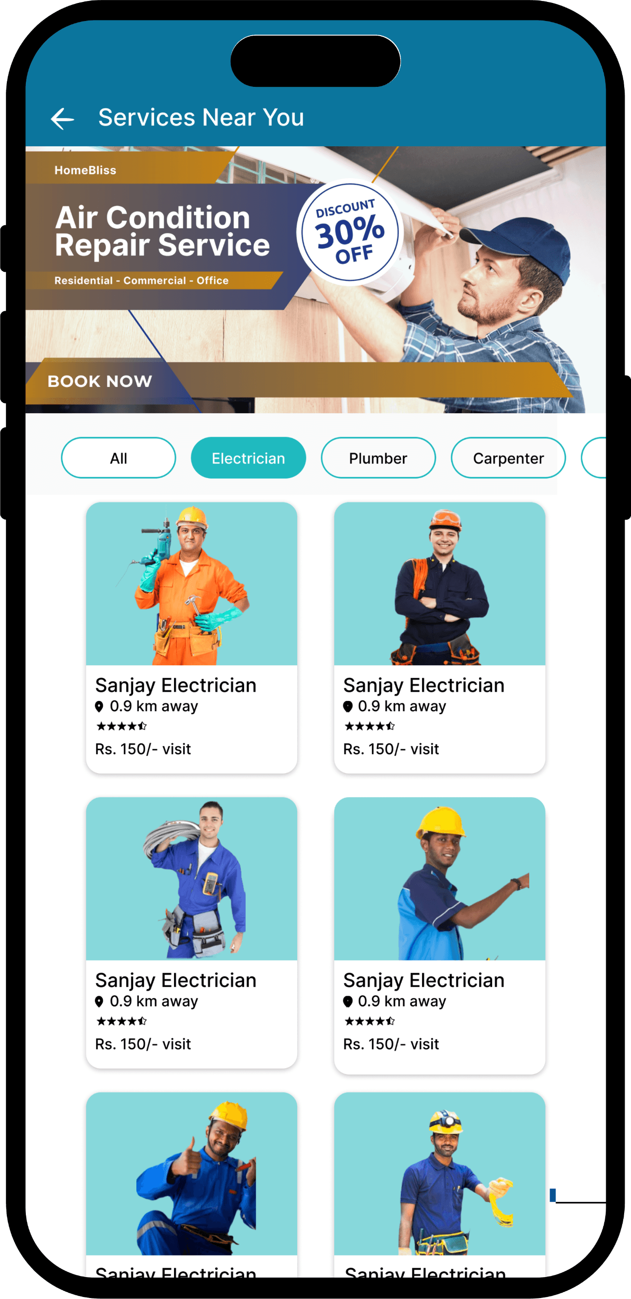HomeBliss is a mobile app aimed at individuals living away from home, such as students, working professionals, and frequent travelers. The app offers quick access to essential services like home-cooked meals, cleaning, repairs, and rentals, while supporting local service providers in expanding their reach.