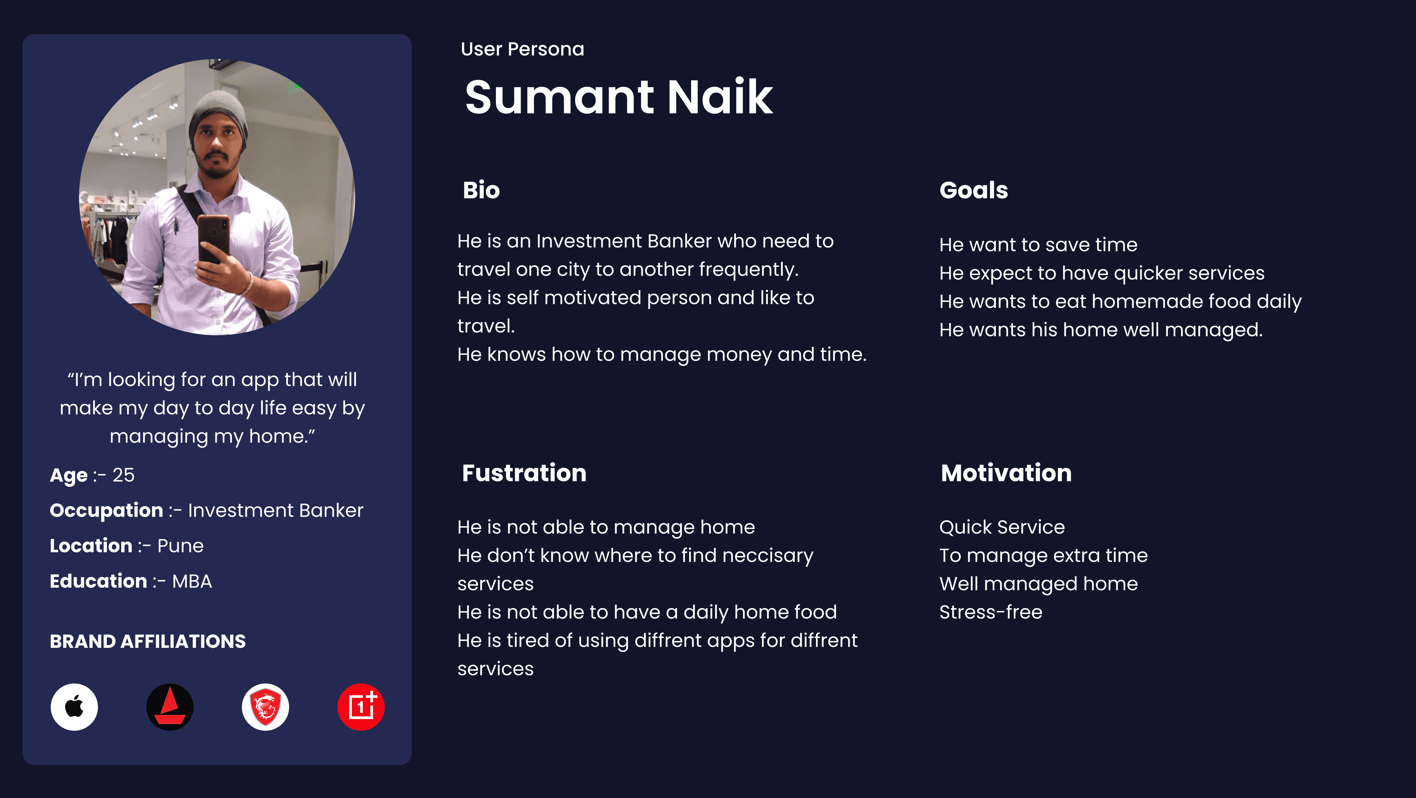 We created personas like Sumant, a busy professional, and Saurabh, a student living away from home, to reflect real user struggles—managing daily services, finding trusted help, and saving time. These profiles guided key design decisions throughout the project.